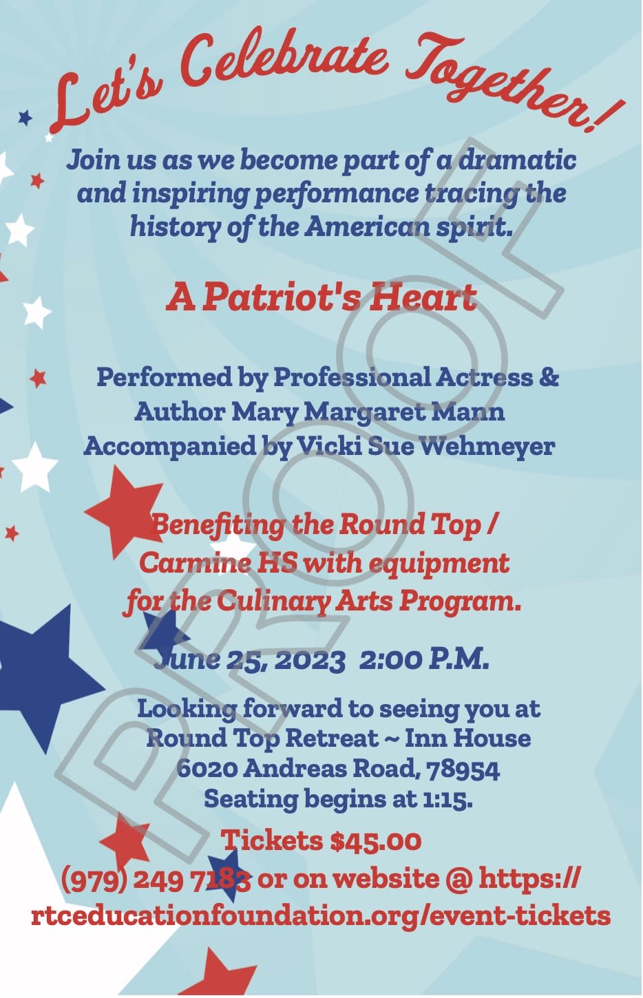 Join us as we become part of a dramatic and inspiring performance tracing the history of the American spirit. A Patriot's Heart performed by Professional Actress & Author Mary Margaret Mann and Accompanied by Vicki Sue Wehmeyer. Benefiting the Round Top-Carmine High School with equipment for the Culinary Arts Program. Date: June 25th, 2023 Time: 2:00pm (Seating begins at 1:15pm) Place: Round Top Retreat (Inn House) - 6020 Andreas Road, Round Top, TX 78954 Tickets are $45 For more information call (979) 249-7183 or visit the website at https://rtceducationfoundation.org/event-ticketsImages