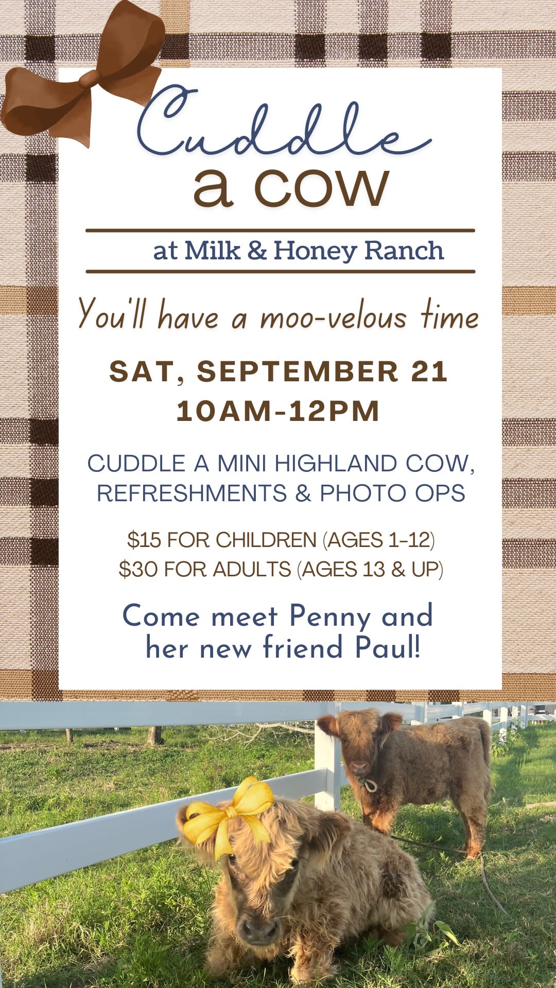Cuddle a Mini Highland Cow! Join us for a heartwarming experience at our upcoming event, where you’ll have the unique opportunity to cuddle with adorable mini highlands; Penny & Paul! Step into a serene setting surrounded by nature, and feel the joy and relaxation that comes from connecting with these beautiful animals. Whether you’re a cow enthusiast, nature lover, or simply looking for a delightful experience, this event promises to be a memorable and uplifting experience for all. Join us and create unforgettable memories with our cuddly mini highland cow calf, Penny and her new friend Paul! Ticket includes meeting and cuddling with Penny or Paul, photo ops, charcuterie, and refreshments! Adult $30 Ages 12 and up. Child $15 Ages 1 – 12. Kids under 1 are free. All tickets are final sale. No refunds or exchanges. https://milkandhoneyranch.com/event/cuddle-a-cow-day-7/