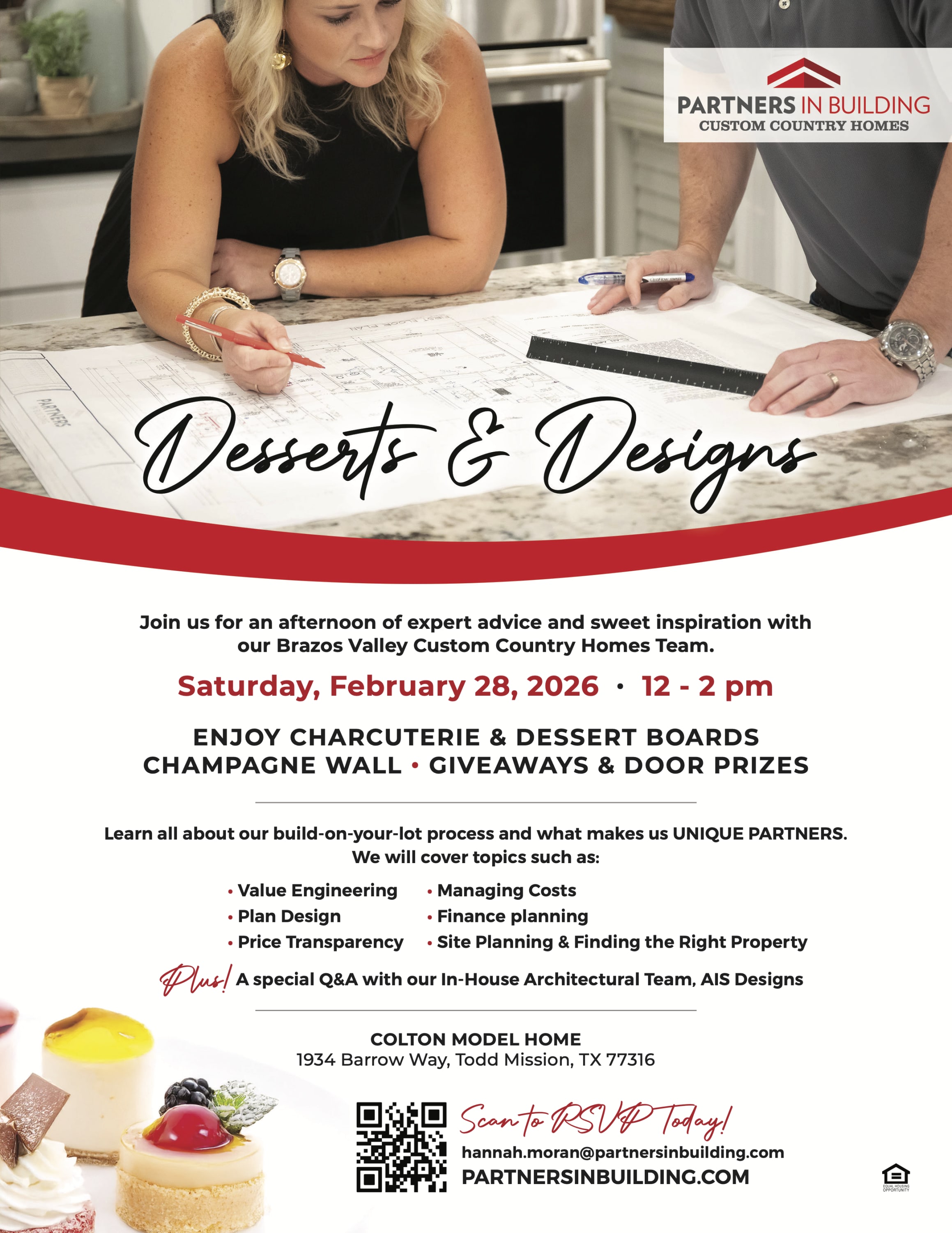 Join us for an afternoon of expert advice and sweet inspiration with our Brazos Valley Custom Country Homes Team. ENJOY CHARCUTERIE & DESSERT BOARDS CHAMPAGNE WALL • GIVEAWAYS & DOOR PRIZES Learn all about our build-on-your-lot process and what makes us UNIQUE PARTNERS. We will cover topics such as: • Value Engineering • Managing Costs • Plan Design • Finance planning • Price Transparency • Site Planning & Finding the Right Property Plus! A special Q&A with our In-House Architectural Team, AIS DesignsImages
