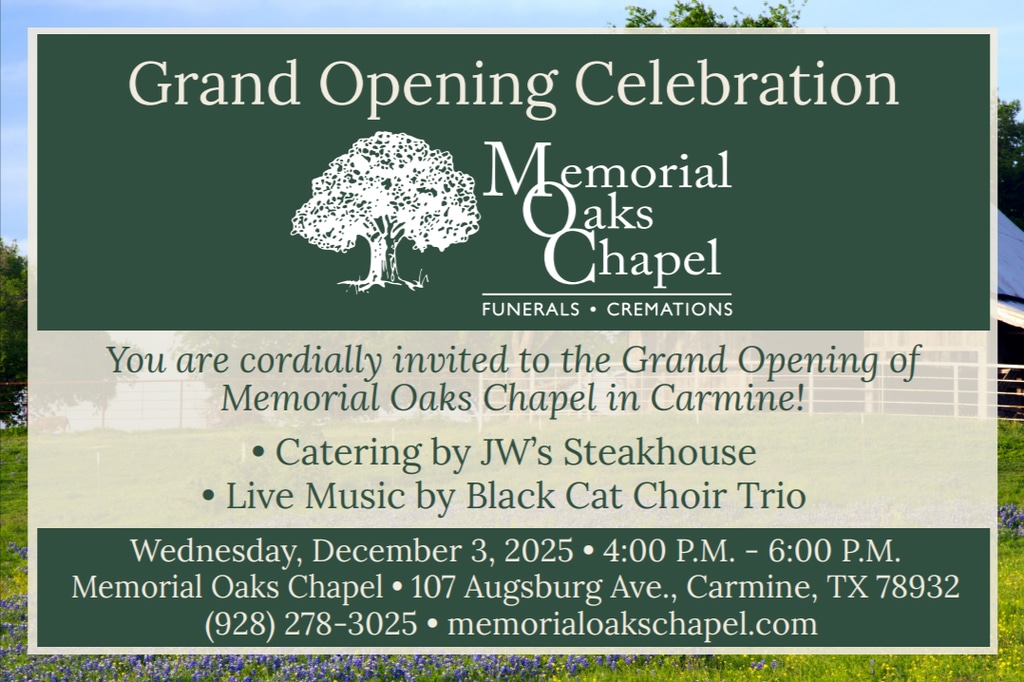 🎉 Grand Opening Celebration – Memorial Oaks Chapel, Carmine 🎉 Join us as we celebrate the Grand Opening of the newest Memorial Oaks Chapel location in Carmine, Texas! Come enjoy an afternoon of great food, live music, community, and exciting giveaways. 📅 Wednesday, December 3, 2025 ⏰ 4:00 PM – 6:00 PM 📍 Memorial Oaks Chapel – Carmine 107 Augsburg Ave, Carmine, TX 🌟 What to Expect: 🍽 Catering by JW’s Steakhouse 🎶 Live Music by the Black Cat Choir Trio 🎁 Door Prizes for attendees who RSVP, including: a 55-inch TV, a Turtlebox Speaker, and an Apple iPad Bring your family and friends and help us celebrate this exciting new chapter for Memorial Oaks Chapel. We can’t wait to welcome you to our new Carmine location!