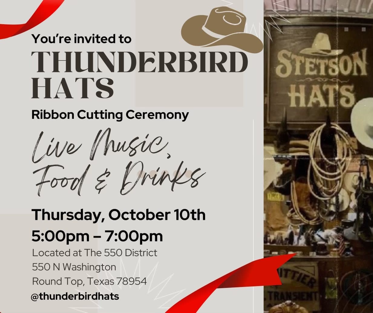 Live Music, Food & Drinks to celebrate Thunderbird Hats new remodel! Thursday, October 10th from 5pm-7pm located at the 550 District, 550 N. Washington St.