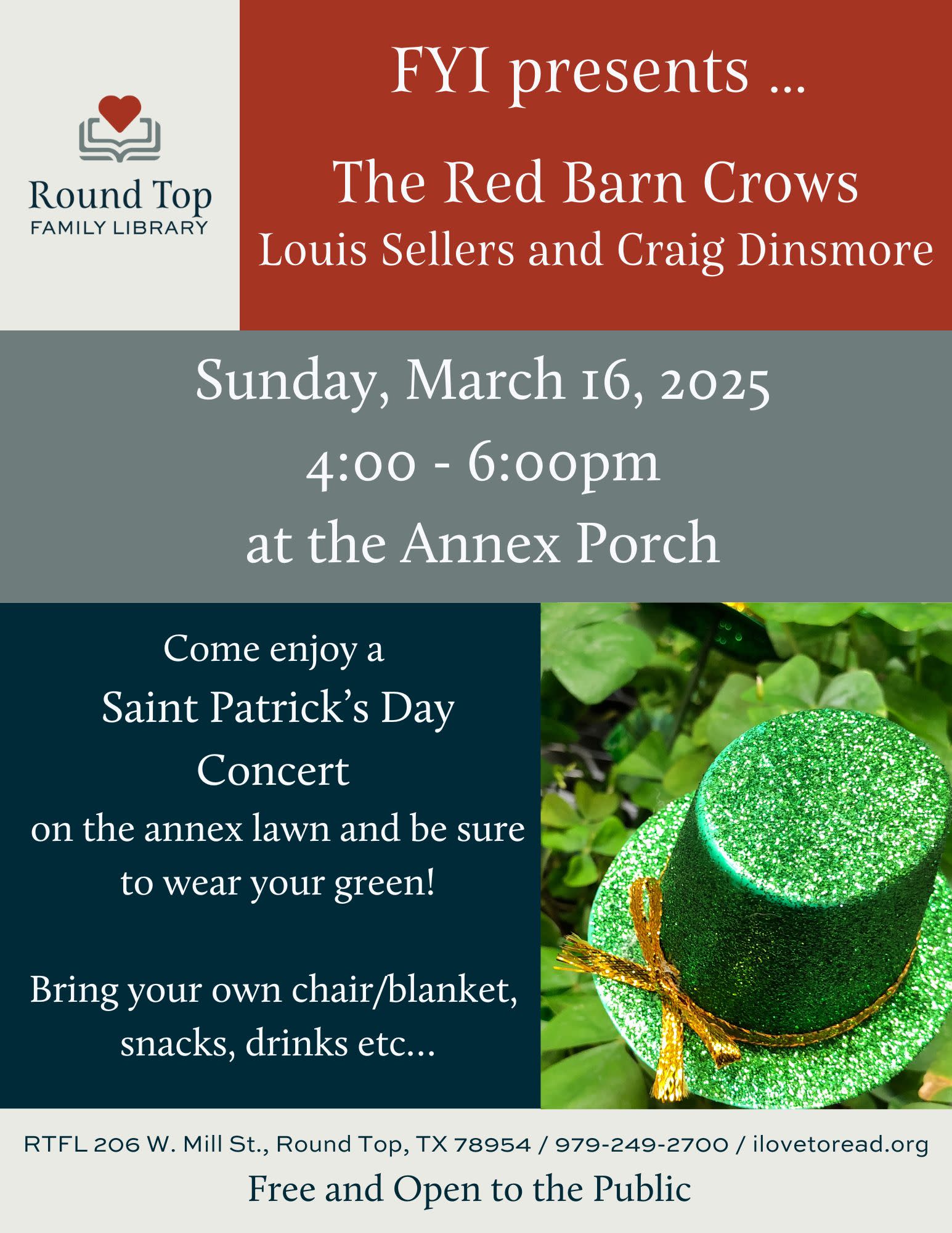 Saint Patrick’s Day Concert with the Red Barn Crows Sunday, March 16, 2025 4:00 - 6:00pm at the RTFL Annex lawn. Bring your own blanket/chairs/snack and drinks. Wear green!