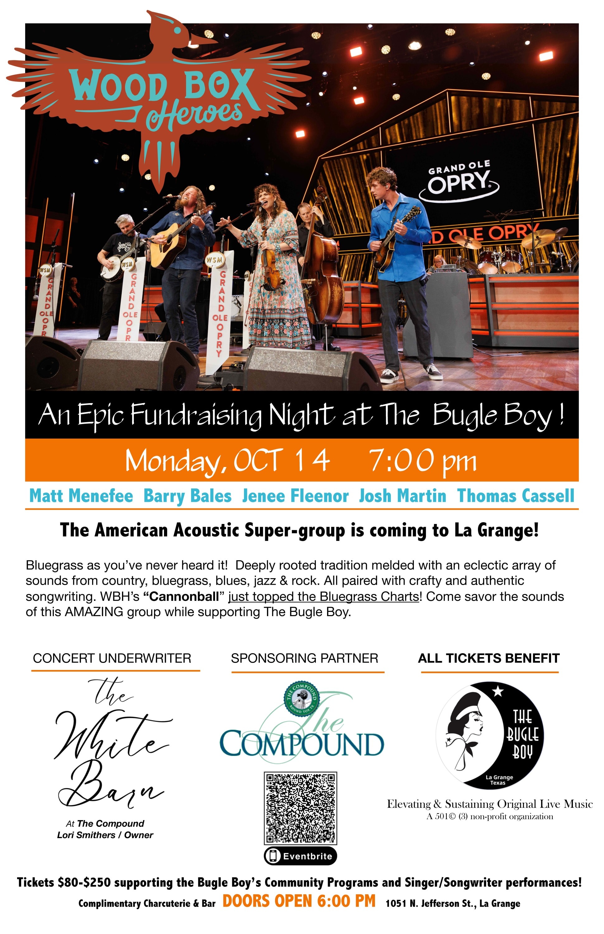 Come join us at The Bugle Boy Listening Room for an epic night of music. The exceptionally talented and seasoned musicians of Wood Box Heroes will be on stage to raise funds for the Bugle Boy organization. It's going to be a night to remember in this intimate setting that honors the singer-songwriter in such a unique way. On this one night, the room will be filled with the award- winning songwriting, vocals and "bluegrass'" stylings of this incredibly talented group of musicians. Don't miss it!